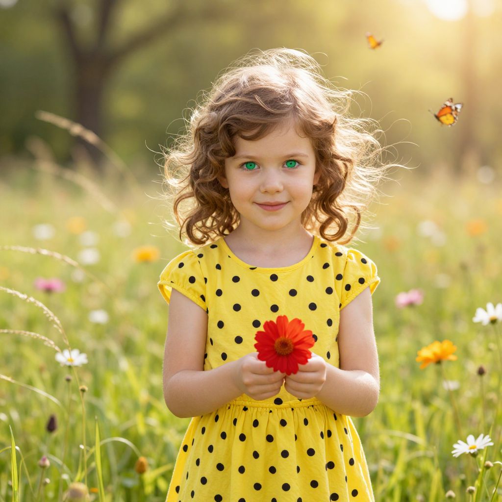 A young girl with curly brown hair and bright green eyes stands in a sunny meadow, wearing a yellow dress with black polka dots. She has a soft, innocent smile, with a few strands of hair gently blowing in the breeze. Her hands are slightly raised, holding a vibrant red flower, as golden sunlight filters through the trees in the background. The scene is vibrant and warm, with soft, lush grass waving gently in the wind and colorful daisies dotting the meadow. A few butterflies flutter nearby, adding to the lively, nostalgic atmosphere. The overall mood is joyful, peaceful, and full of childhood wonder, evoking a sense of timeless beauty and simple happiness.
