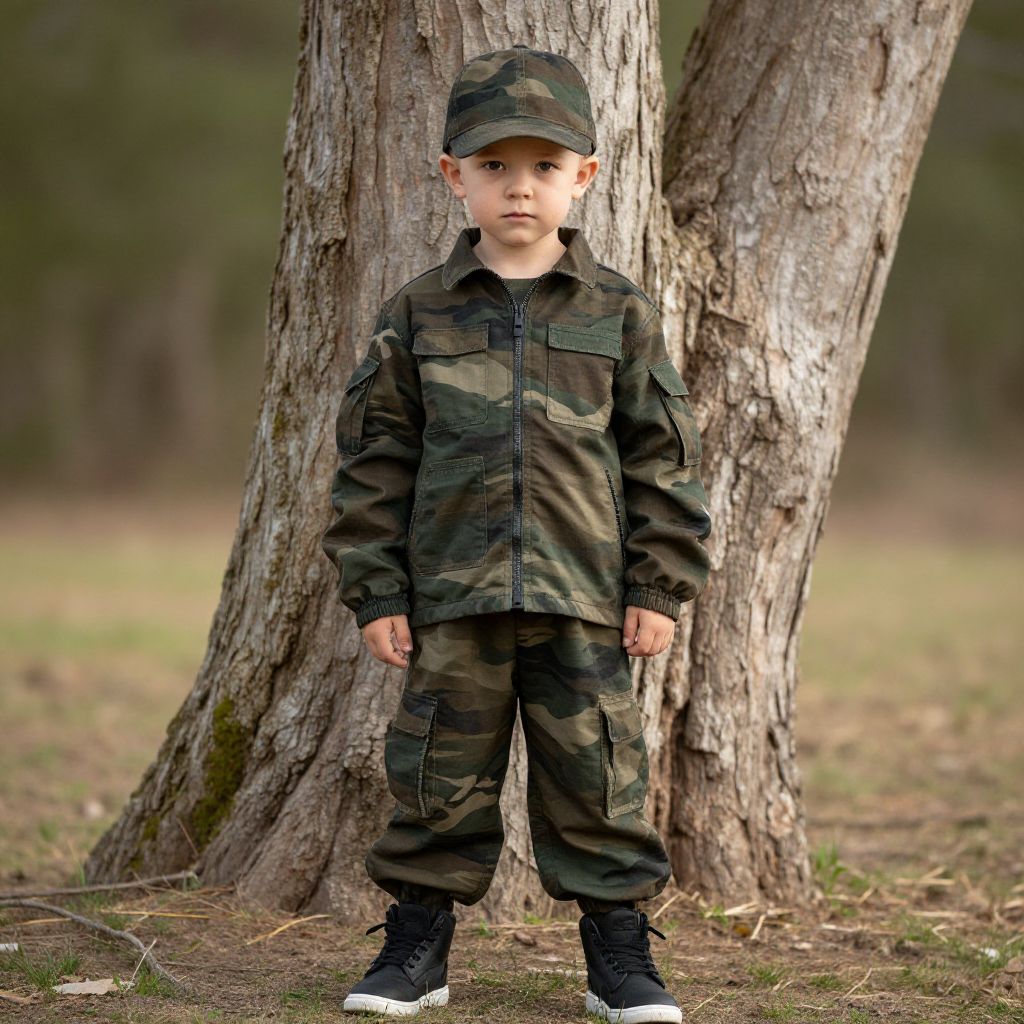 Camo Costume Boy, boy in camouflage jacket standing in front of tree