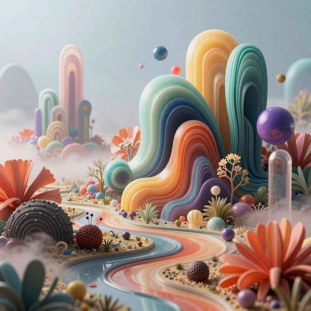 Image art AI generating a surreal digital landscape, merging vibrant abstract shapes with realistic textures, futuristic neon colors blending with organic forms, high detail, ethereal lighting, and seamless integration between machine creativity and artistic expression.