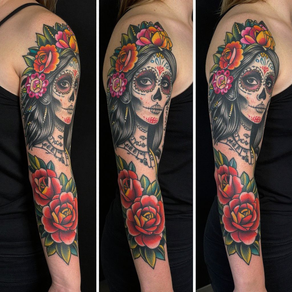 Photograph of a woman's upper arm tattoo featuring a colorful Day of the Dead skull adorned with flowers, surrounded by vibrant roses and green leaves.