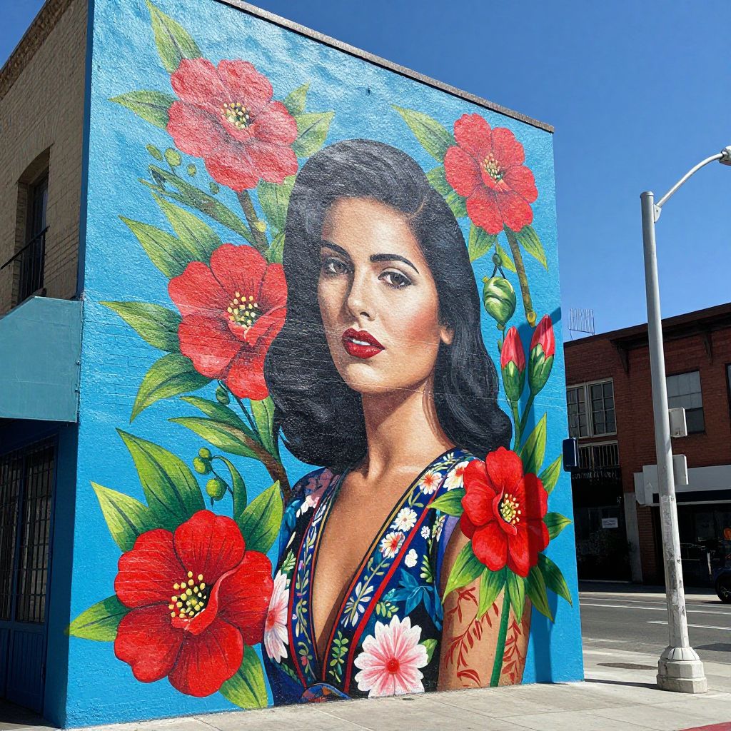 Vibrant mural depicting a woman with dark hair, red lips, and floral-patterned attire stands prominently on a brick wall in Los Angeles Chinatown, surrounded by colorful red flowers and green leaves against a bright blue background, while a streetlamp and urban buildings frame the scene to the right.