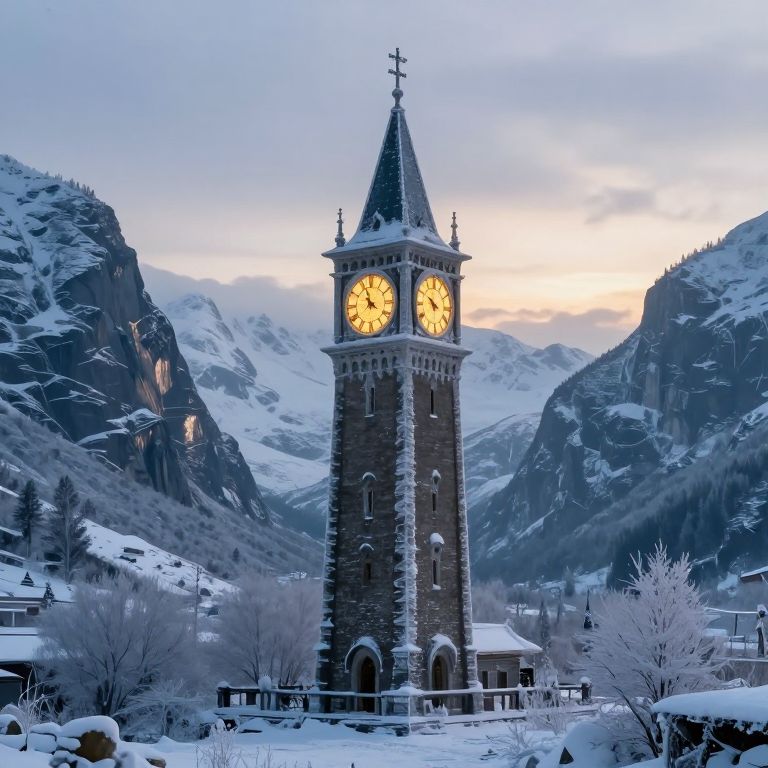 Icy clock tower stands tall amidst a frosty valley, its luminous faces glowing warmly against the frigid backdrop as snow-covered cliffs rise majestically on either side, reflecting a surreal blend of light and shadow.
