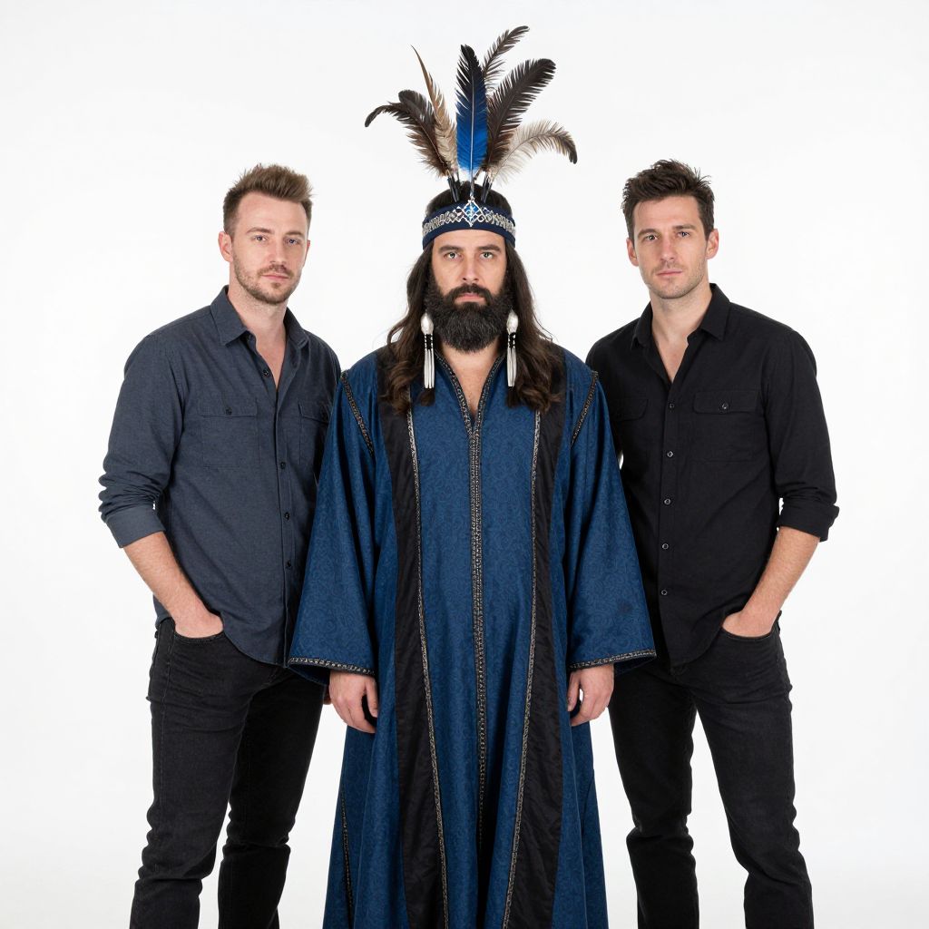 A bearded man in blue and black clothing with feathers in his hair stands against a white background, artwork by Igor Burlakov, Xavier Collette, and Greg Tocchini.