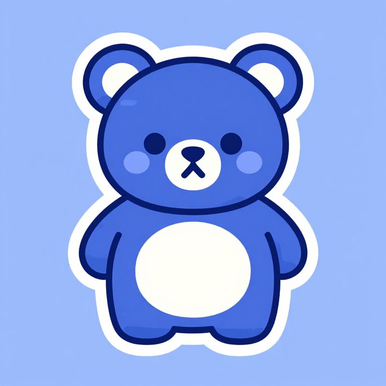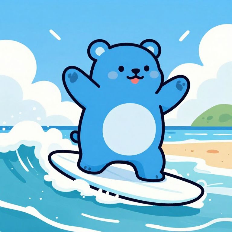 Blue bear cartoon surfing on ocean waves, sunny beach scene, dynamic pose, cheerful and energetic, colorful and bold lines, fun summer vibe