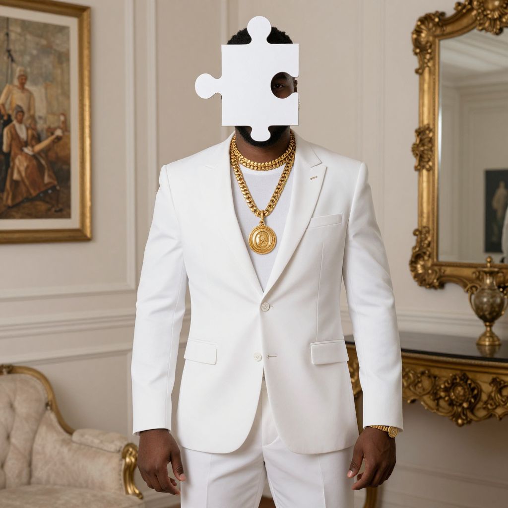 Jigsaw Piece Costume, man in a white suit and gold jewelry standing in a room