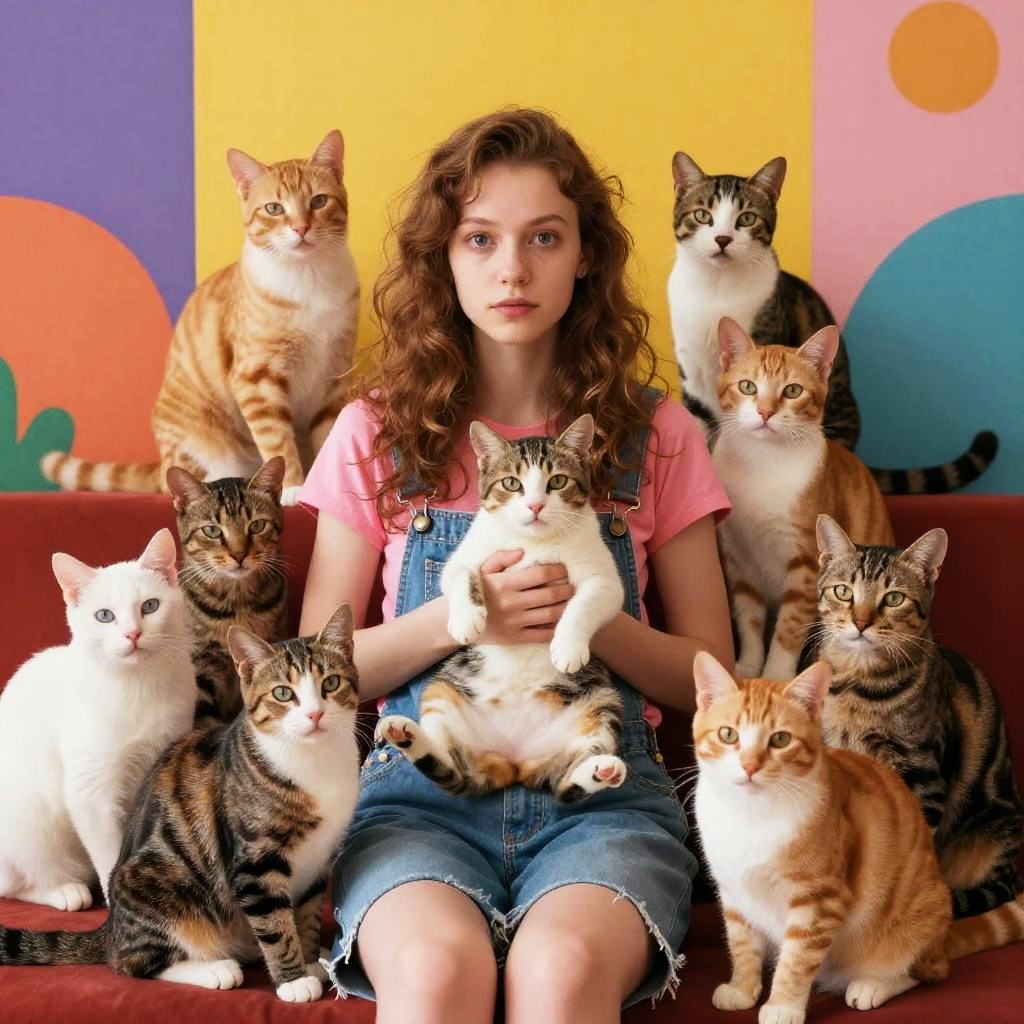 Realistic photo.a young woman surrounded by an unreasonable amount of energetic cats, in vivid psychedelic colors. Inspired by Arthur Frank Mathews, Alisa Burke, Anna Silivonchik, and Bill Bell. realistic photo