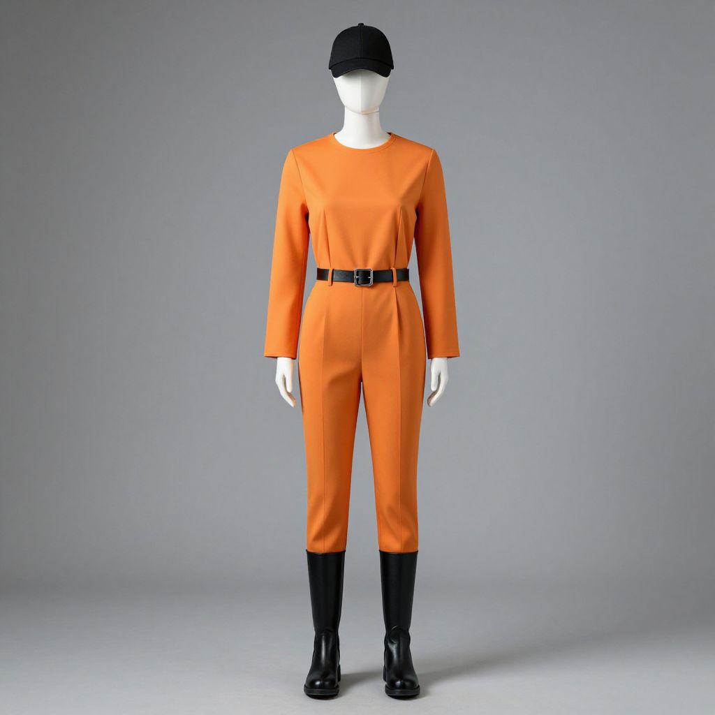 Mannequin wearing orange costume with black hat and black boots.