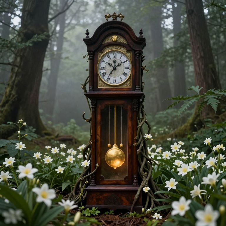 In a misty forest where time seems to breathe, a grandfather clock entwined with life itself stands as a paradoxical beacon, its golden pendulum casting a warm glow that whispers secrets of eternity while the surrounding moonflowers bloom in a dance of transience, inviting contemplation amidst the timeless embrace of nature.