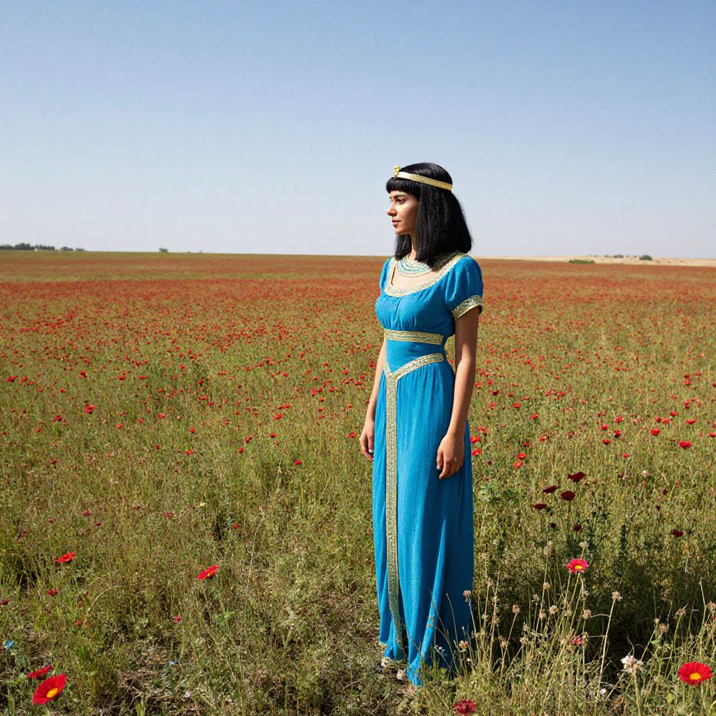 "Ancient Egyptian Art landscape shot of a woman in a beautiful blue dress standing in a vast field of crimson flowers,"