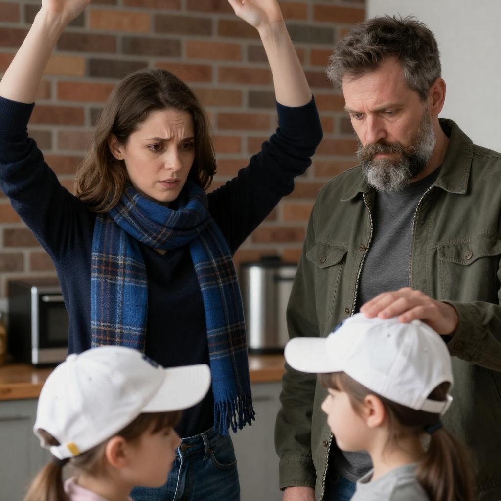 Photograph of two adults and two children. Woman with brown hair, wearing a dark sweater and blue plaid scarf, has arms raised, looking concerned. Bearded man with gray hair, wearing green jacket, touches child's head. Children wear white caps. Background: brick wall, kitchen counter with appliances. Woman's intense expression, man's focused expression. Casual indoor setting.