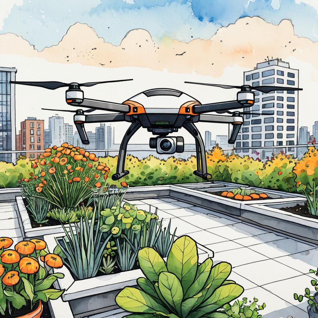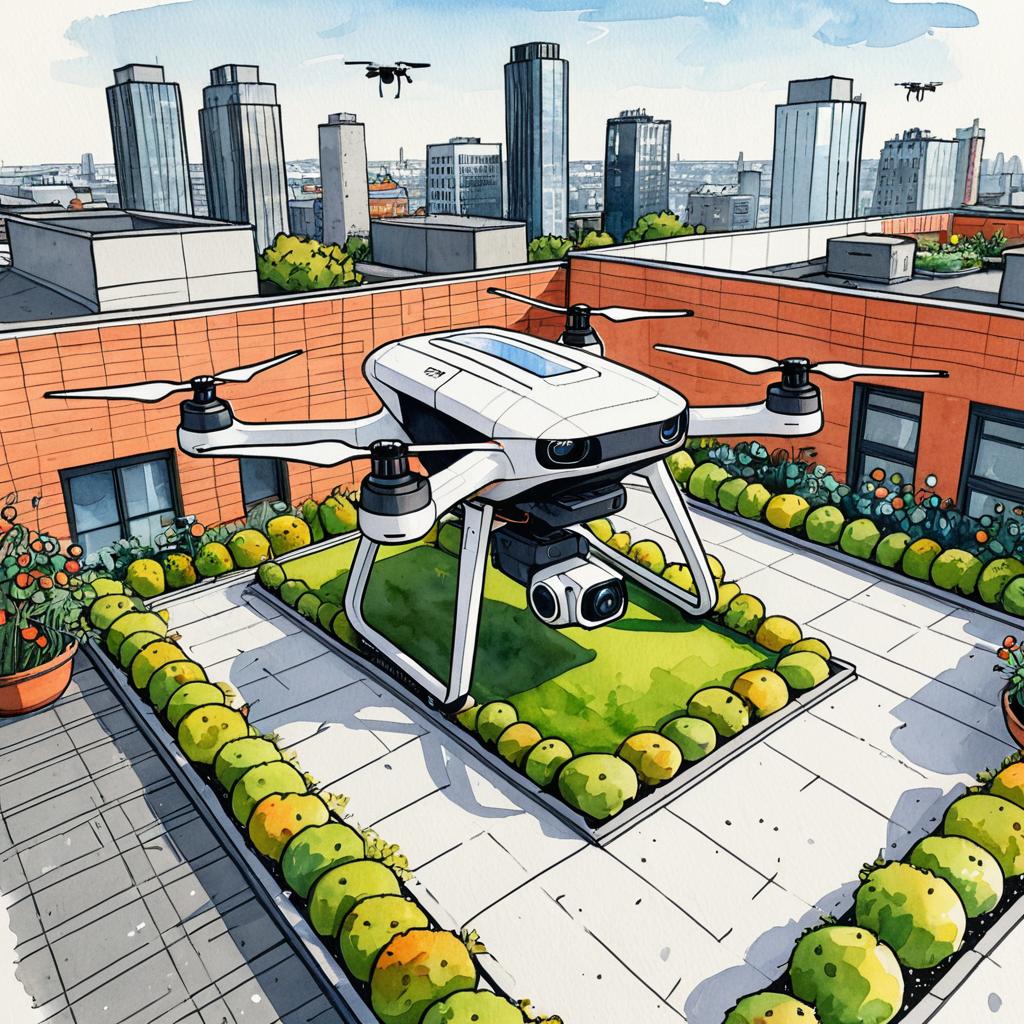 Illustration of a friendly delivery drone with big expressive eyes and smooth shapes, hovering in a modern urban rooftop garden. The rooftop features colorful flowers, green hedges, and a background of city skyscrapers. Rendered in vibrant watercolor style with bold outlines.