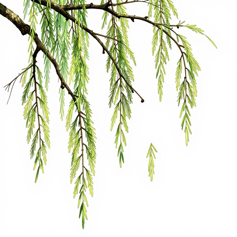Photograph of slender, green pine tree branches with delicate, needle-like leaves against a stark white background, capturing a serene, natural texture.