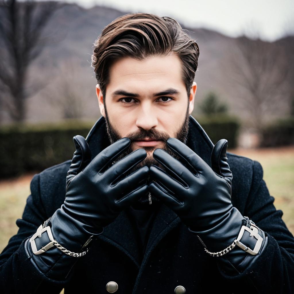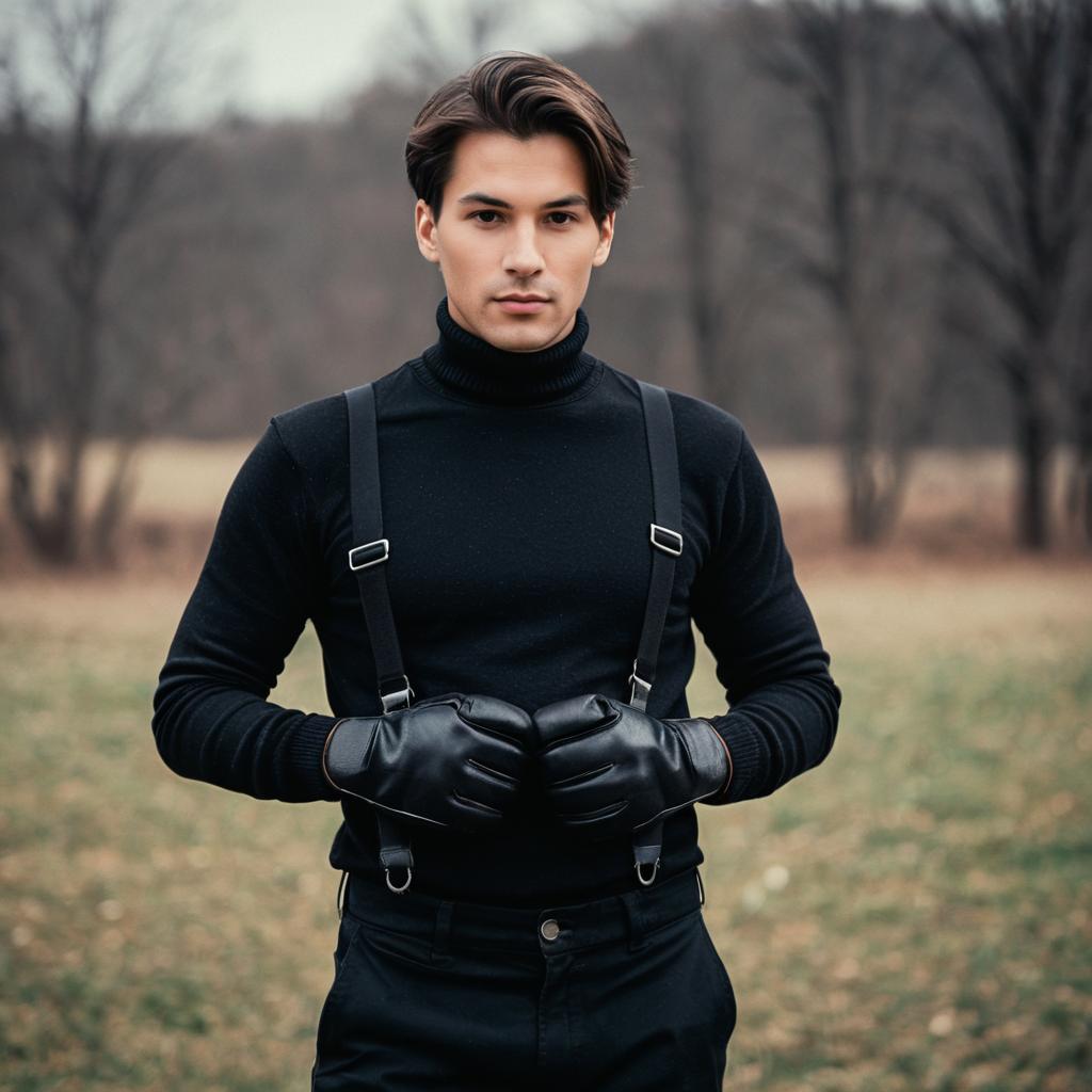 Young man with brown hair wearing a black turtleneck sweater paired with black suspenders and black leather gloves standing outdoors in a blurred park or natural background. He is looking directly at the camera with a neutral expression, dressed in all black long-sleeve clothing, including black pants. The setting appears to be in autumn or early winter with bare trees in the distance.
