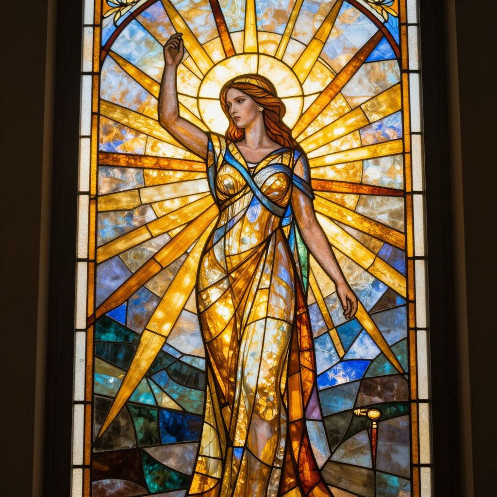 Stained glass artwork of a radiant, golden-robed woman with long brown hair, standing against a sunburst background, with blue and orange hues.