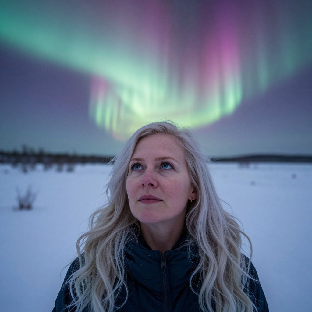 Photograph of a blonde woman with long hair, wearing a black coat, standing in a snowy landscape, gazing at vibrant green and pink aurora