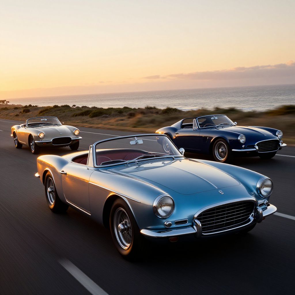 1960s sports cars racing down a coastal highway at sunset, vibrant colors reflecting off polished chrome, classic roadster and coupe models with detailed interiors, dynamic motion blur, retro style aesthetics, cinematic lighting
