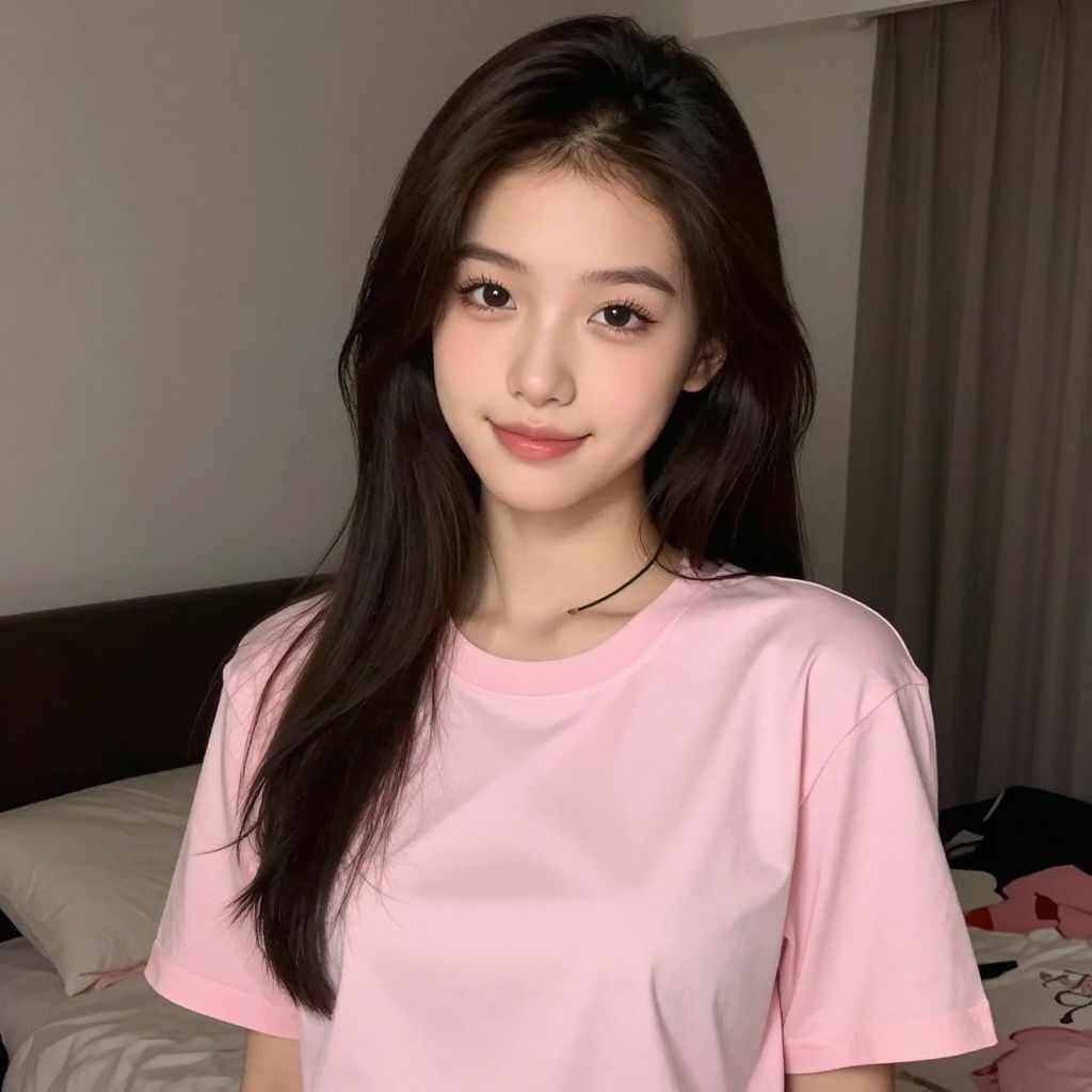 Upper body portrait of an 18 year old Filipina girl, girl next door, bad quality, jpg, hyperrealistic, cute, adorable, perfect radiant skin, petite, small body, (medium perky breasts), tight body, thin, slender, wearing a oversized pink t shirt, cinematic lighting, innocent, perfect face, beautiful face, long radiant hair, thin lips, bright radiant eyes, long detailed eyelashes, adorable face, natural face, perfect proportions, posing in messy girls bedroom, night, cute shy smile, choker necklace