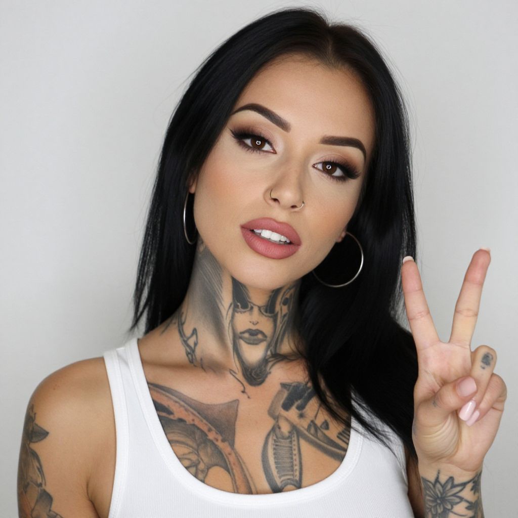 Photograph of a tattooed woman with long black hair, light skin, and brown eyes. She's wearing a white tank top, hoop earrings, and a nose ring. Her face and neck are covered in black and grey tattoos, including a portrait on her neck. She's making a peace sign with her right hand and has full eyebrows, dark eyeliner, and pink lipstick. The background is plain white.