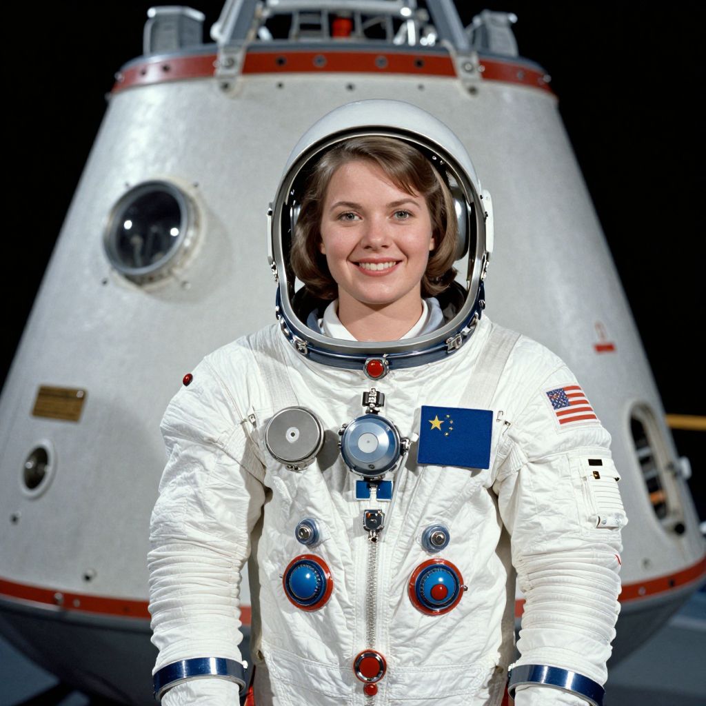 Soviet cosmonaut Valentina Tereshkova stands confidently in her spacesuit, smiling warmly in front of the Vostok capsule, commemorating her historic flight as the first woman in space on June 1963.