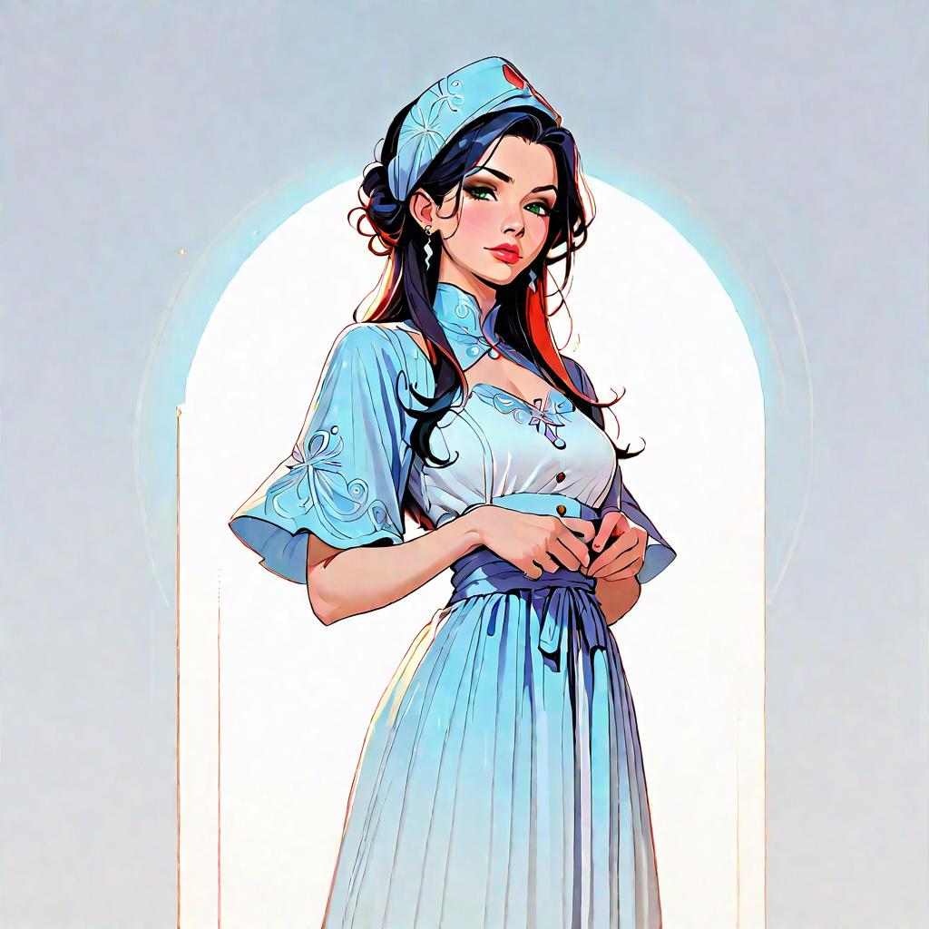 Digital illustration of an elegant woman with an hourglass figure wearing a flowing blue dress and a matching ofuda (Japanese paper talisman) headband. The artwork features soft, volumetric lighting and high resolution detail, showcasing delicate embroidered patterns on the dress and a confident expression. The style combines elements of traditional Asian influences with modern digital art techniques.