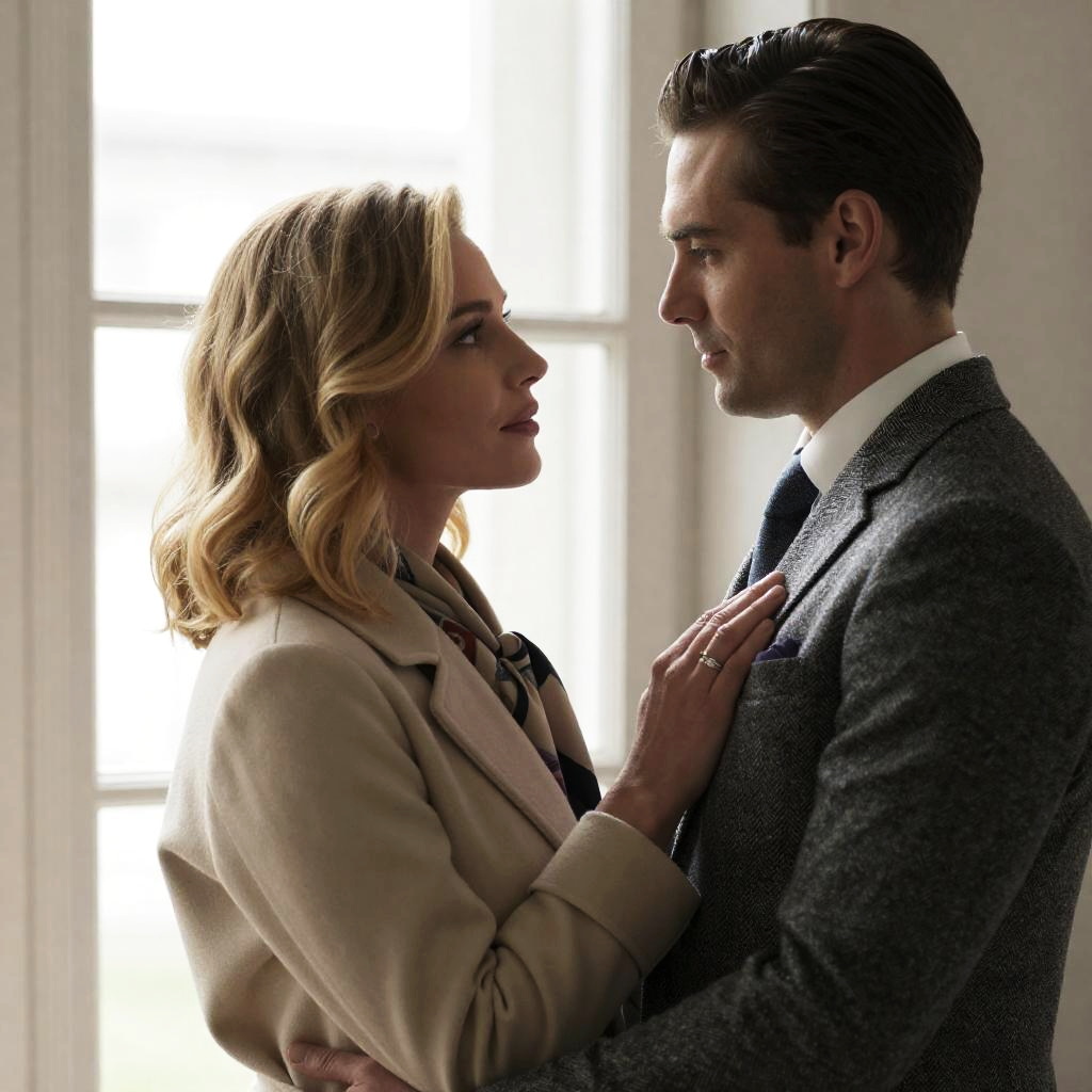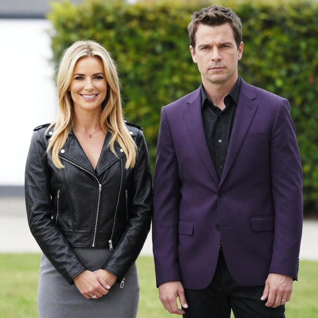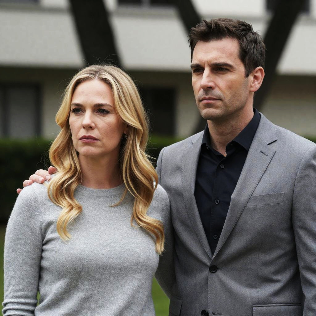 Photograph of two people outdoors. Blonde woman with wavy hair, gray sweater, serious expression, stands beside dark-haired man in gray suit, black shirt, neutral expression. Background includes blurred trees and building. Both look to the left. Man's hand on woman's shoulder.