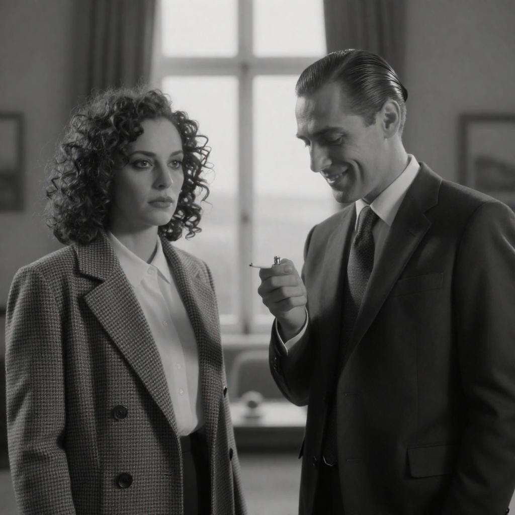 Black-and-white photograph of three men and one woman in an indoor hallway. Woman with dark hair, light robe, leaning against wall. Middle man with dark mustache, dark suit, bowler hat, standing. Right man with checkered cap, turtleneck, leather jacket, holding gloves. Background has patterned wallpaper and blurred figure. Intense expressions.