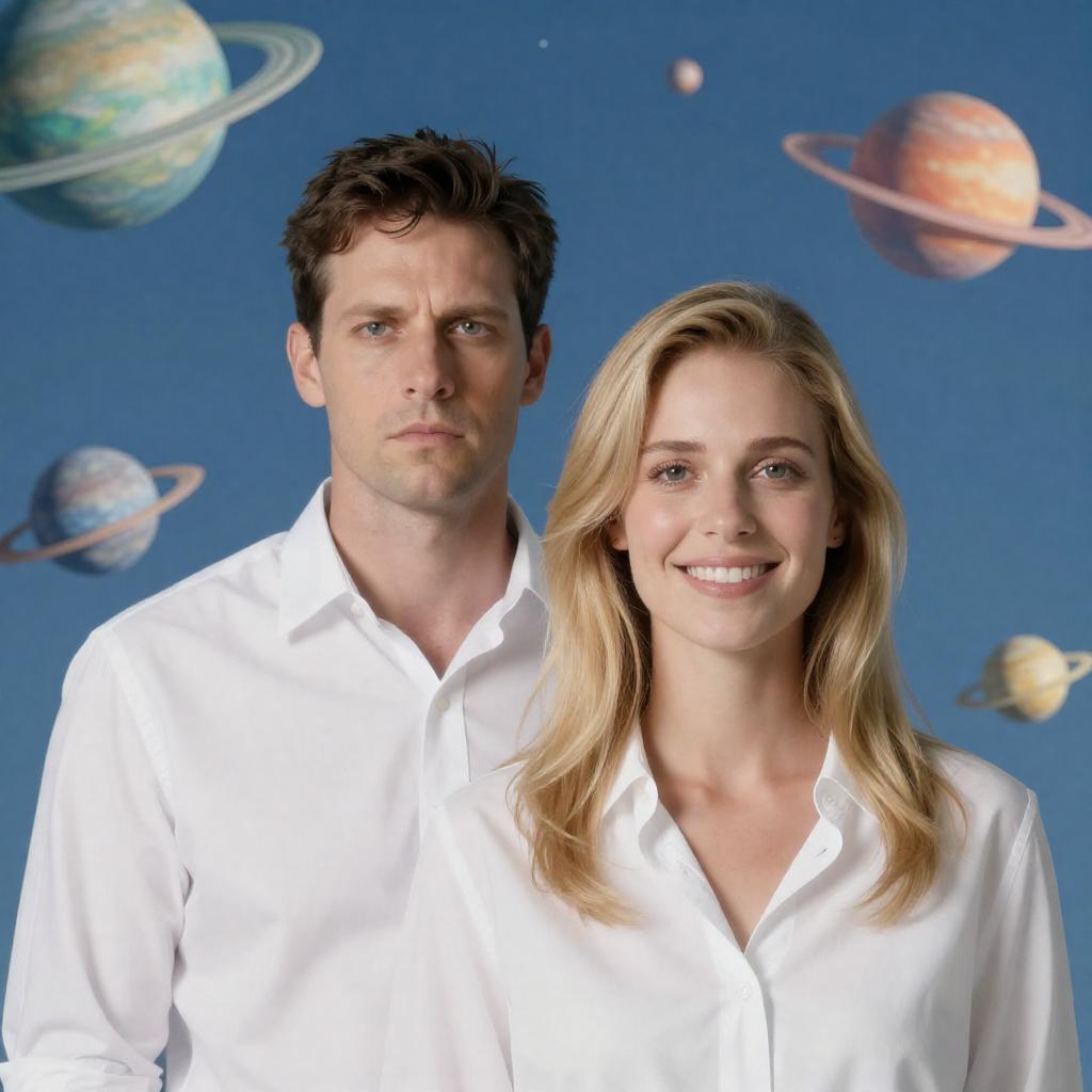 Photograph of a man and woman with space background. Man has short dark hair, light skin, serious expression. Woman has blonde hair, light skin, smiling. Both wear white shirts. Planets in colors (green, orange, blue, yellow) float around them. Clear blue sky with stars in background.