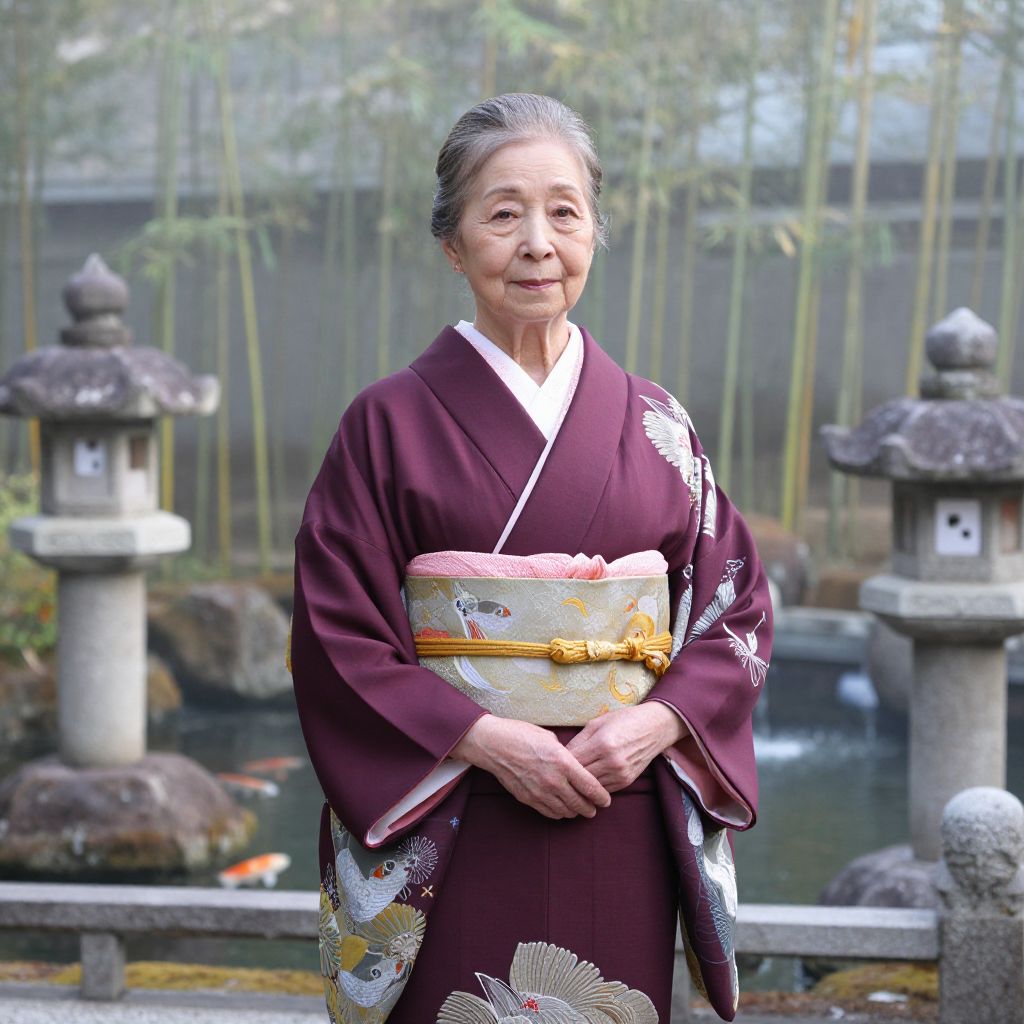 Photograph of an elderly Asian woman with gray hair, wearing a maroon kimono adorned with white floral patterns and a yellow and white obi sash. She stands in a traditional Japanese garden with a calm pond, bamboo, and stone lanterns in the background. Her hands are clasped in front of her, and she has a gentle smile. The garden features moss-covered stones and a wooden fence, creating a serene, traditional atmosphere. The lighting is natural, highlighting the woman's calm demeanor and the intricate details of her kimono and the garden.