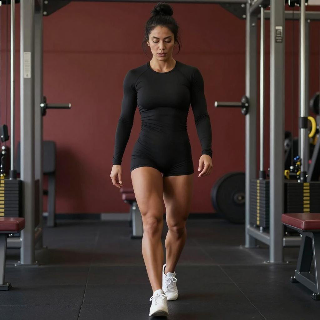 Photograph of a fit woman with tan skin and dark hair in a bun, wearing a black tight t-shirt and shorts, white headphones, and a white headband. She stands in a dimly lit gym, leaning forward with hands behind her back, focusing downward. Gym equipment is blurred in the background.