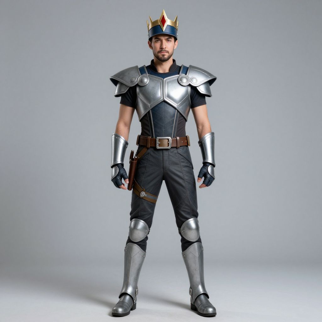 Photograph of a man standing in front of a plain grey background. He wears a metallic crown with red, yellow, and gold accents, black shirt, and black pants. He has silver shoulder armor, matching elbow and knee guards, and black gloves. A brown leather belt with a silver buckle and a small pouch is around his waist. He also wears grey knee-high boots. The man has a short beard and a neutral expression. The image has a professional studio lighting setup, emphasizing the metallic textures and the sharpness of his attire.