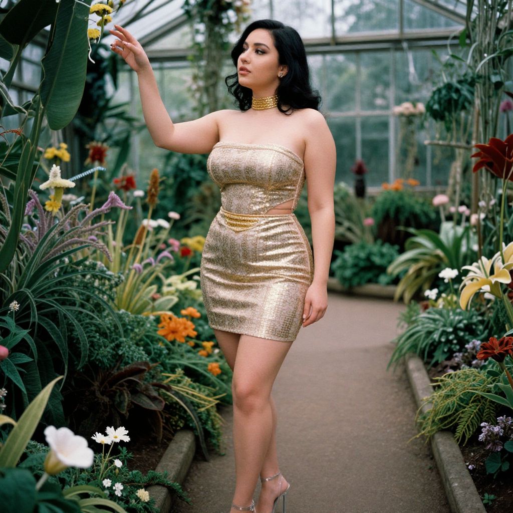 A curvy woman, glamorous, in a strapless bodycon mini dress with golden sequin patterns, straight neckline, cut-out waist, fitted silhouette, matching golden choker, stud earrings, clear strap high heels, in a Wonderland greenhouse with magical plants, captured in Eastman film stock style, admiring the enchanting flora. Sexy. Pretty face and beаutiful eyes. Big breasts
