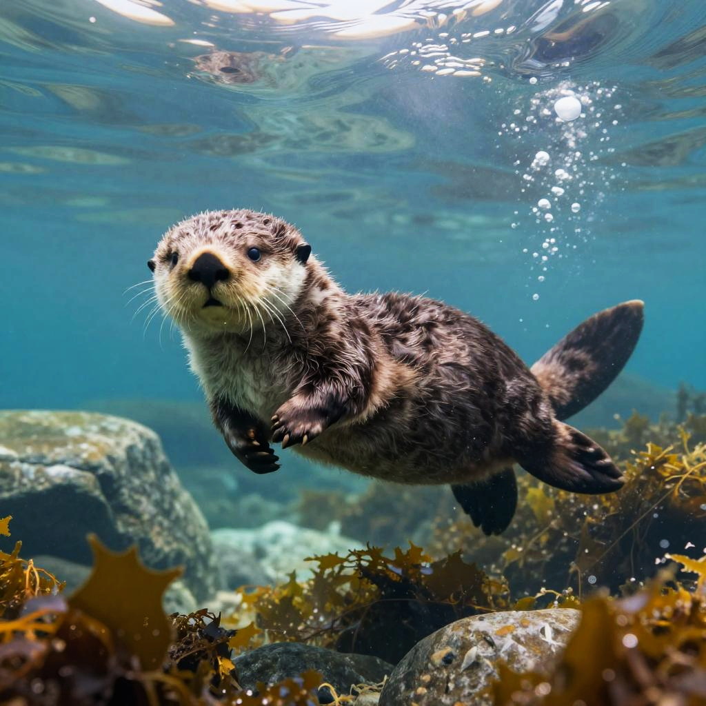 Highly detailed illustration of a playful sea otter diving underwater, in a rocky coastal shore with seaweed beds, with cool midday sunlight filtering through waves, soft textures, serene mood, intricate fur patterns, HD quality, gentle shadows, creating an inviting atmosphere for relaxation