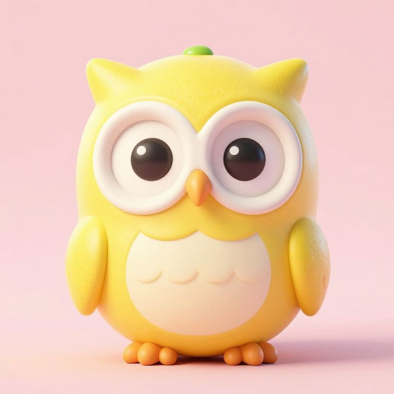 This is a digitally-rendered, 3D cartoon-style image of a cute, yellow owl with large, expressive black and white eyes. The owl has a round, plump body with a white chest, small orange feet, and orange beak and wing tips. Its wings are slightly raised, and it has small, green-tipped ears. The background is a solid, light pink color, making the owl stand out prominently. The owl's texture is smooth and shiny, giving it a playful, animated appearance. The image exudes a whimsical and child-friendly vibe.