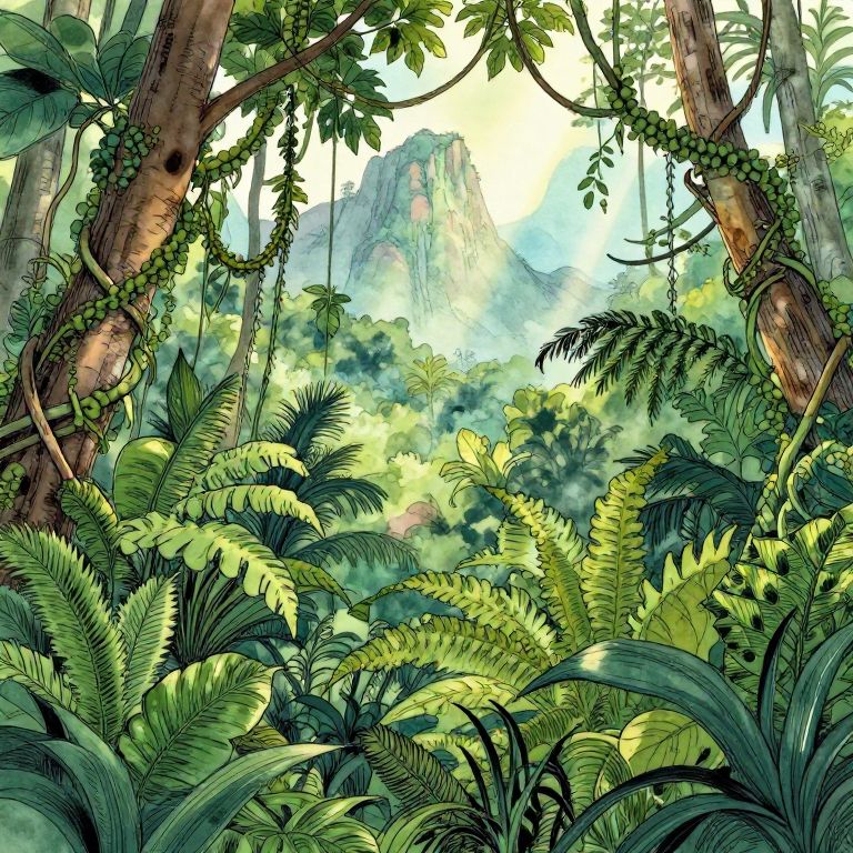 Jungle drawing background showcasing an exotic forest vista with thick vegetation, sprawling ferns, climbing vines, distant mountain peaks, and soft beams of light piercing through leaves, drawn with fluid ink lines combined with subtle watercolor washes for a magical effect.