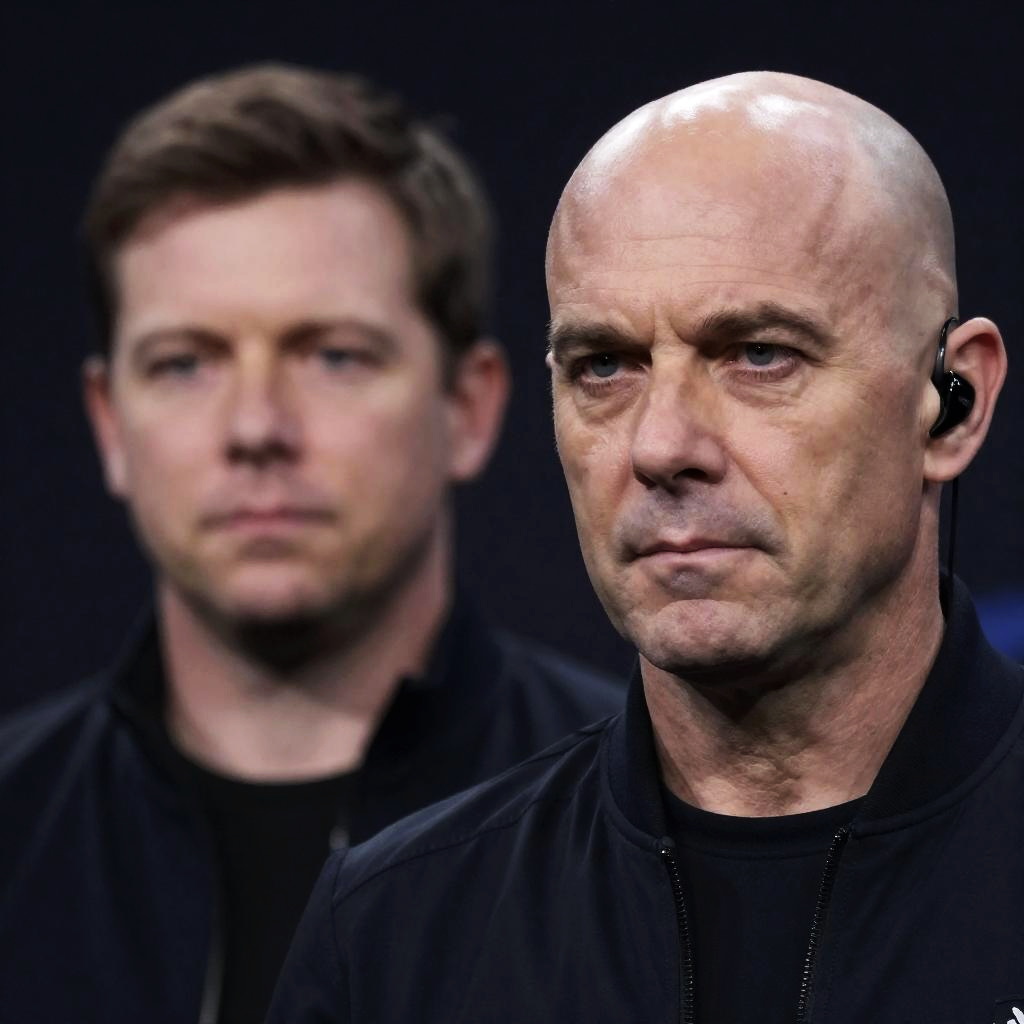 Close-up of a middle-aged man with a bald head and dark hair on the sides, intense expression, looking upward. Dark background with blurred lights in the bottom left. Man wears a dark suit and white shirt.