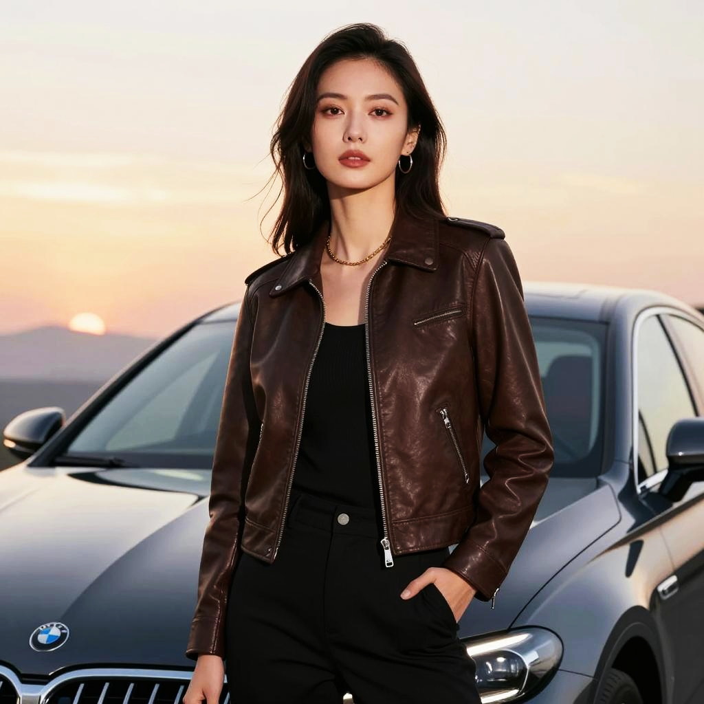 A confident woman poses in a stylish leather jacket, exuding a sense of empowerment against a backdrop of a luxury car and a stunning sunset. The image captures the essence of modern lifestyle and elegance, perfect for fashion and automotive themes.
