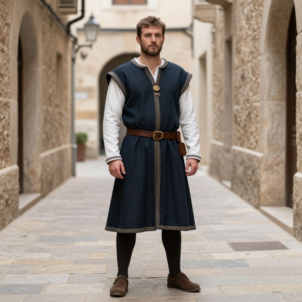 Photograph of a bearded Caucasian man standing in a narrow, stone-paved alleyway with arched doorways on either side. He wears a medieval-style outfit: a dark blue, sleeveless tunic with white long-sleeved shirt underneath, brown leather belt, black pants, and brown shoes. The tunic has gold trim and a brooch at the neckline. His brown hair is short and slightly tousled. The background features blurred stone buildings with lanterns, giving a historic European village feel. The man stands confidently, hands by his sides, with a neutral expression. The alleyway has a slightly uneven stone texture.