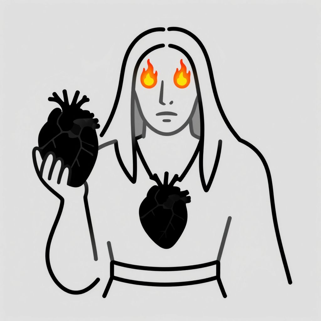 Digital drawing of a simplistic, black-and-white figure with long, straight hair, wearing a robe. The figure has two glowing orange-yellow eyes and two black, heart-shaped objects on their chest and left hand. The background is plain white, emphasizing the stark contrast of the black lines and glowing eyes. The figure's expression is neutral, and the style is minimalistic with bold, thick lines. The overall composition is abstract and slightly eerie, focusing on the glowing eyes and heart shapes.