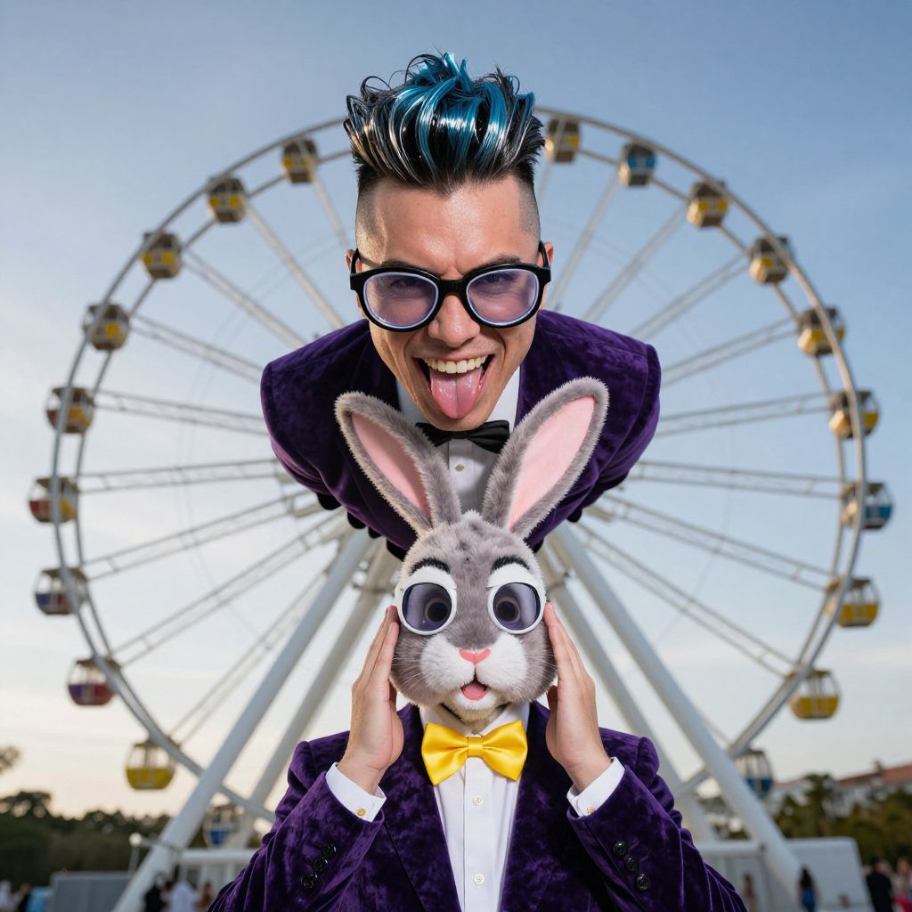 Photograph of a man with short, dark blue, and black styled hair, wearing black sunglasses and a black tuxedo with a white shirt and yellow bow tie. He is playfully sticking his tongue out while holding a gray plush rabbit with large, round, black eyes and a pink nose. The rabbit wears a yellow bow tie. The background features a large, white Ferris wheel with yellow cabins against a clear blue sky. The Ferris wheel is slightly out of focus, emphasizing the man and rabbit in the foreground. The image has a vibrant, slightly exaggerated, and surreal style.