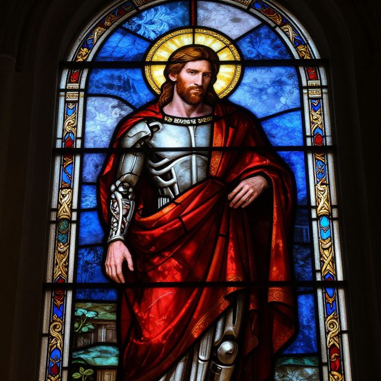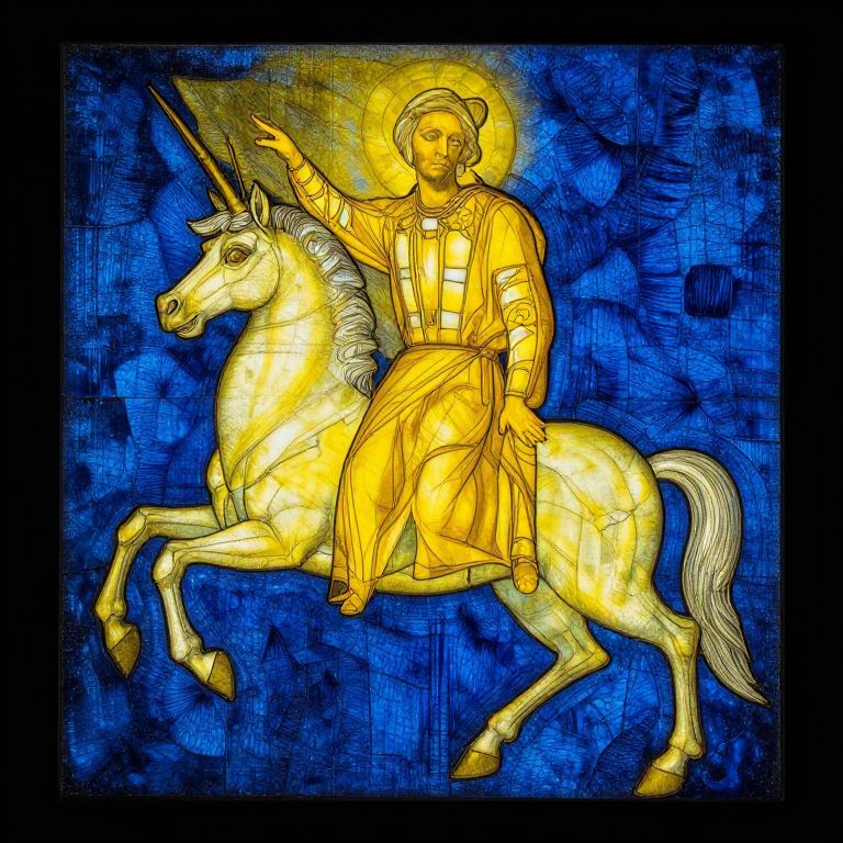 Stained glass artwork of a haloed, robed figure with a unicorn, glowing yellow against a deep blue background. The figure raises one hand,