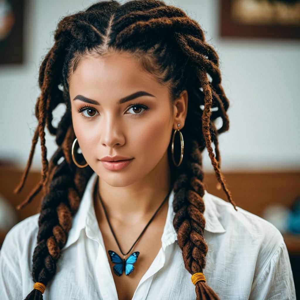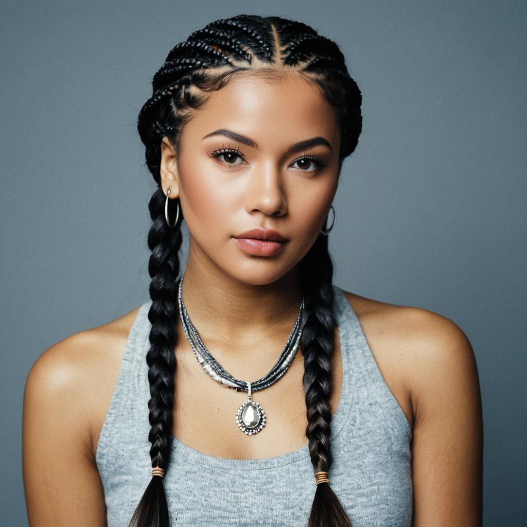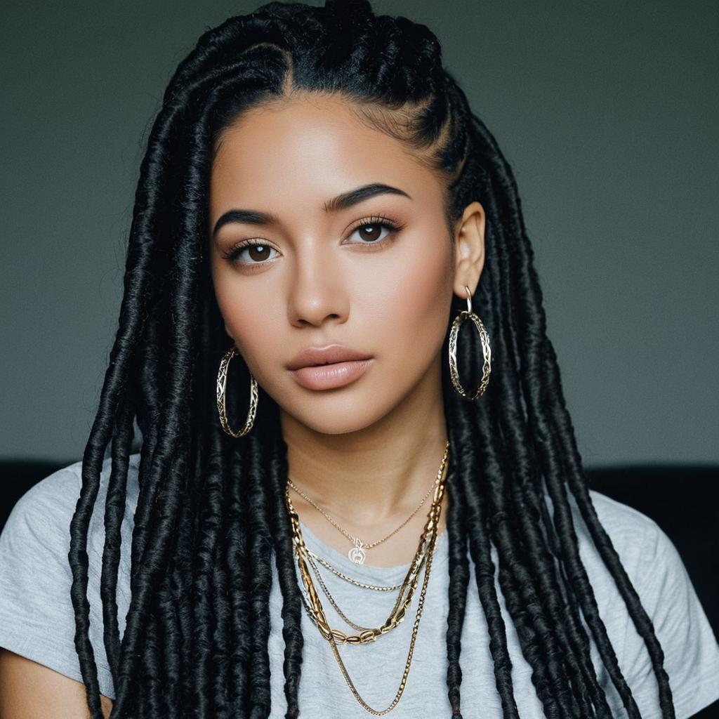Portrait of a young woman with long dark brown knotless braids featuring curly ends. She wears gold chain earrings and two necklaces, one gold and one black with a pendant. She is dressed in a white short-sleeve shirt and looks directly at the camera with a neutral expression. The background is a plain soft grey.