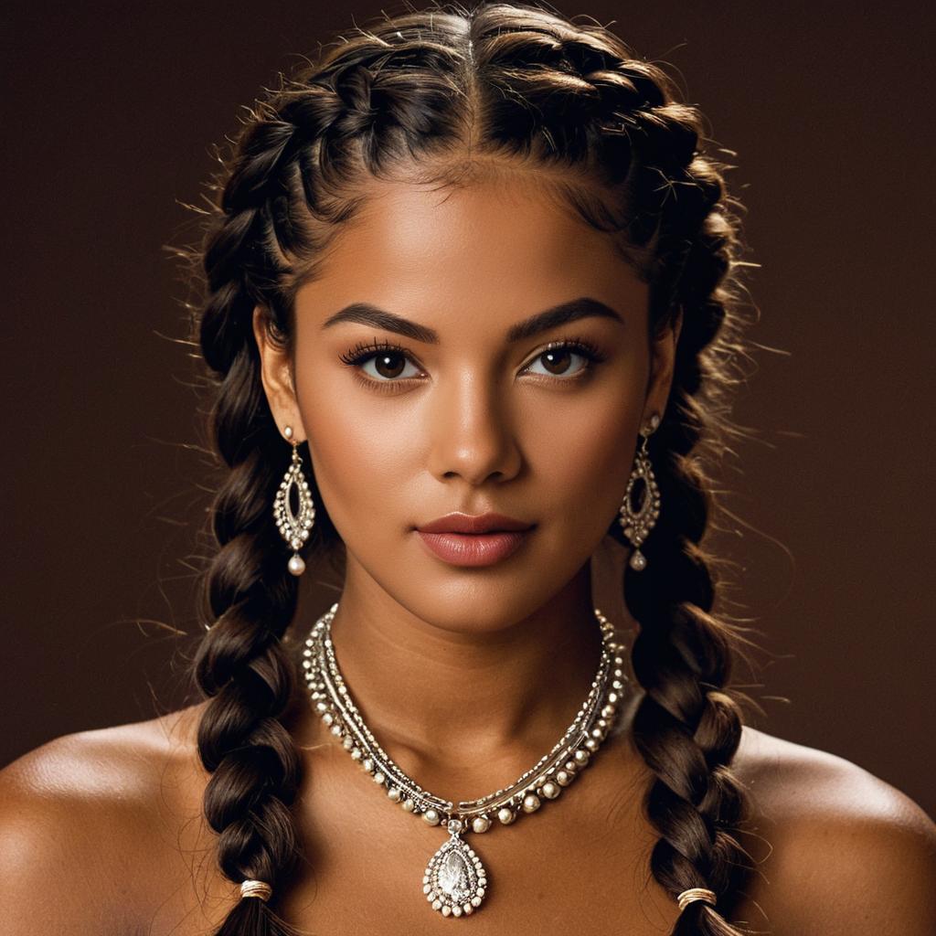 Knotless braids curly ends,1girl, jewelry, solo, earrings, realistic, long hair, necklace, curly hair, brown hair, looking at viewer, upper body, lips, short sleeves, photorealistic, shirt, multiple braids, nose, closed mouth