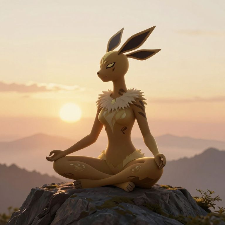 Digital artwork of a serene, anthropomorphic Eevee-like creature meditating on a rock at sunset, with a mountainous background. Warm, golden