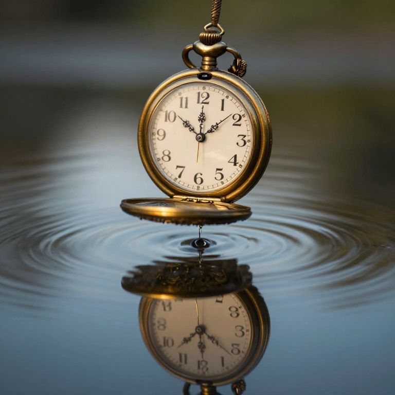Photograph of an antique, gold-colored pocket watch with a white face and black numerals, standing upright on a reflective, rippling water surface. The watch's reflection is clearly visible beneath it. The background is blurred with soft blue and green hues, emphasizing the watch. The watch has a winding crown on top and a chain attached. Water ripples surround the base of the watch, creating a serene, almost magical atmosphere. The overall lighting is soft, highlighting the watch's metallic sheen and the delicate ripples in the water.