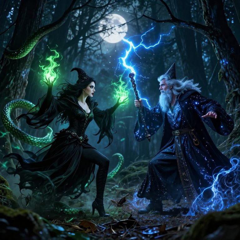 Under the moonlit canopy of a haunted forest, the sexy witch and the wizard faced each other, their eyes glinting with determination, Shadows danced around them, responding to the rising tension, The sexy witch, draped in flowing black robes, extended her arms, chanting ancient incantations, Green flames erupted from her fingertips, twisting into snarling serpents that slithered through the air toward the wizard, Undeterred, the wizard, with his silver beard and robes glowing like starlight, countered with a powerful sweep of his staff, An arc of blue lightning surged forth, colliding with the green serpents in a burst of dazzling sparks, The air crackled with raw energy, echoing the fury of their clash, The ground beneath them trembled as the sexy witch summoned a whirlpool of dark energy, enveloping herself in a protective shield, She whispered a spell, causing the trees around them to uproot and hurl themselves at the wizard, He responded with a wave of his hand, conjuring a barrier of shimmering light that disintegrated the incoming trunks into harmless splinters, Their spells became more frenzied, with the sexy witch calling forth icy winds that cut through the forest and the wizard commanding bolts of pure fire to rain down from the sky, The battle raged on, each opponent matching the other’s ferocity, their powers entwined in a breathtaking display of magical prowess