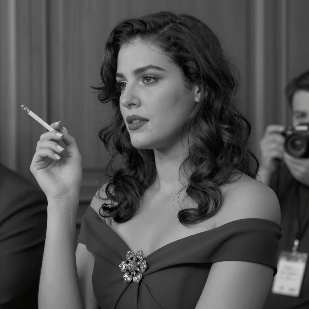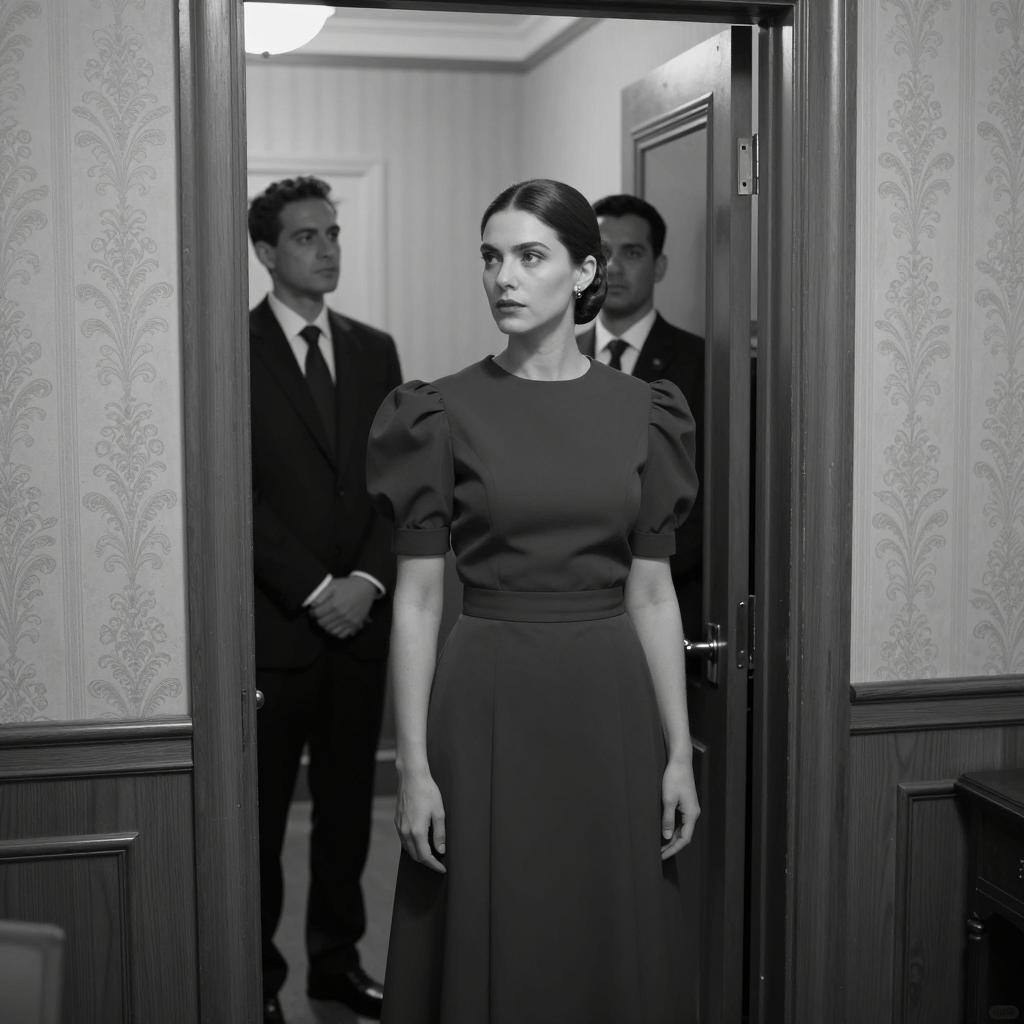 Black-and-white photograph of a woman in a dark dress with puffed sleeves and a high waist, standing in a hallway. Three men in dark suits stand in the doorway. Patterned wallpaper, wooden door, and wainscoting in the background. Woman gazes to the left, expression neutral. Two men in doorway look towards woman, one man partially obscured.