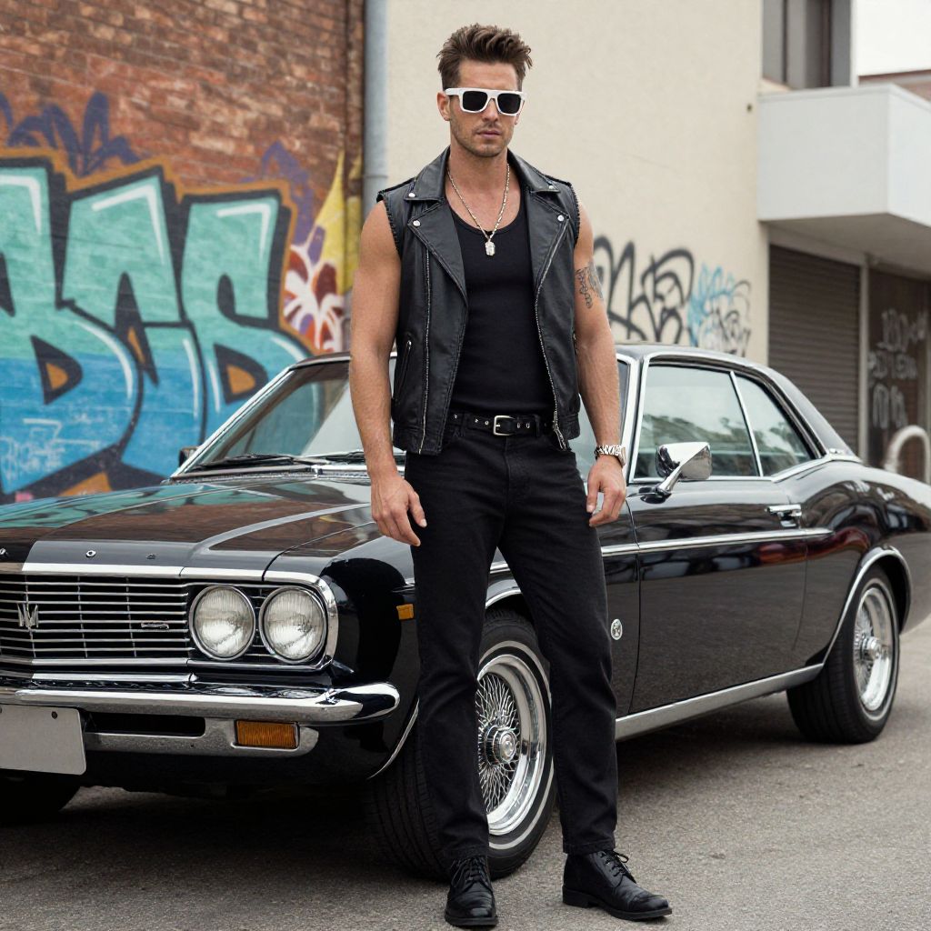 A stylish man stands confidently in front of a classic car, set against an urban backdrop with graffiti art. The image exudes a retro and edgy vibe, reminiscent of urban street style photography.
