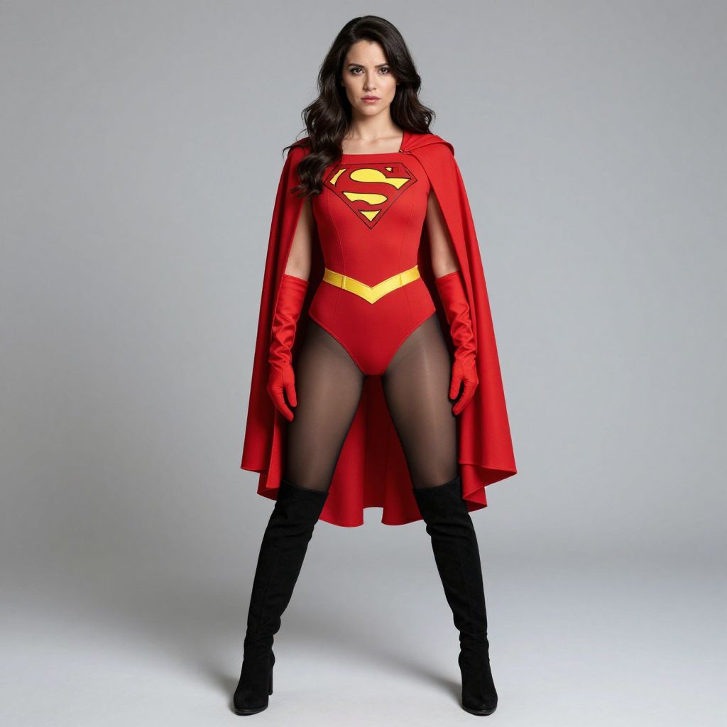 Photograph of a woman dressed as Supergirl. She's standing confidently against a plain gray background. She wears a red cape, red bodysuit with a yellow "S" emblem, red gloves, black sheer tights, and black knee-high boots. Her long, wavy dark brown hair is loose, and she has a serious expression. The overall look is bold and superhero-esque.