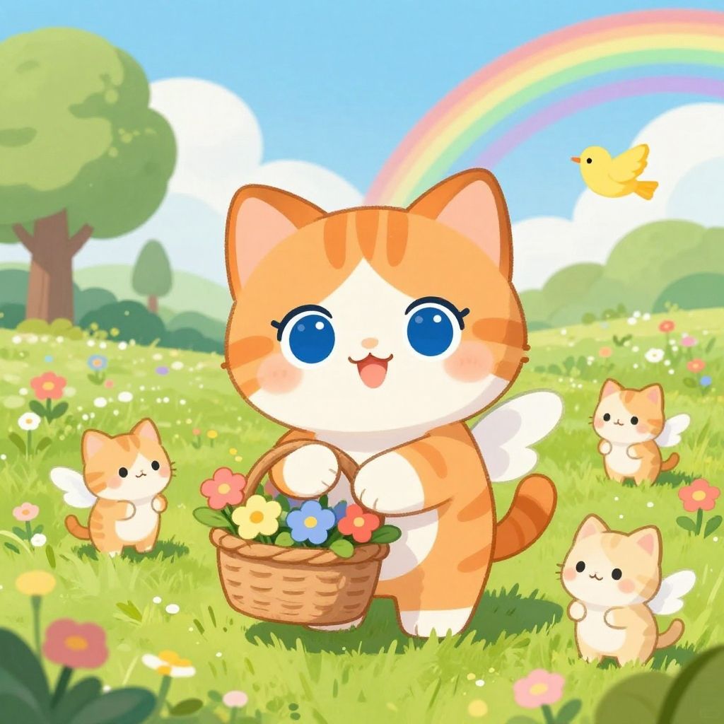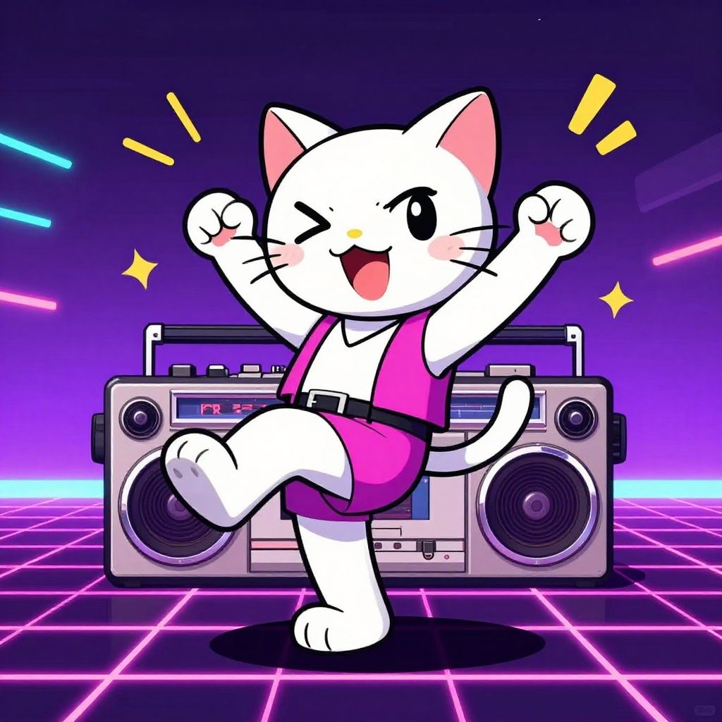 Vivid psychedelic artwork of a blue-colored anthropomorphic cat musician playing a yellow guitar, surrounded by numerous dancing cats in bright blue, orange, and pink colors. The background features swirling rainbow patterns and scattered confetti elements, creating a dynamic and whimsical scene inspired by psychedelic art styles.