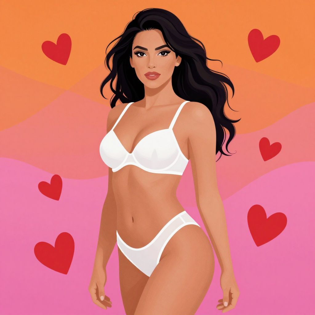 Sensuous illustration featuring a woman with cascading dark hair, wearing a white lingerie set, posed confidently against a vibrant background of orange and pink hues dotted with red hearts.